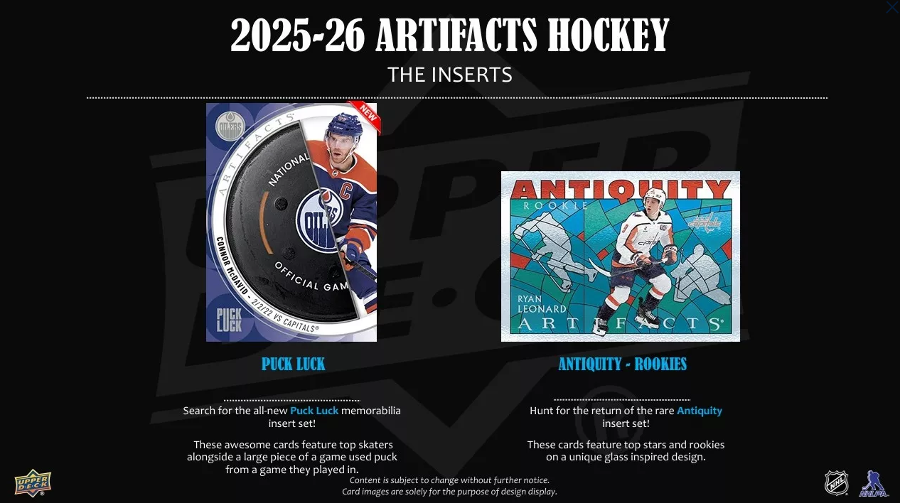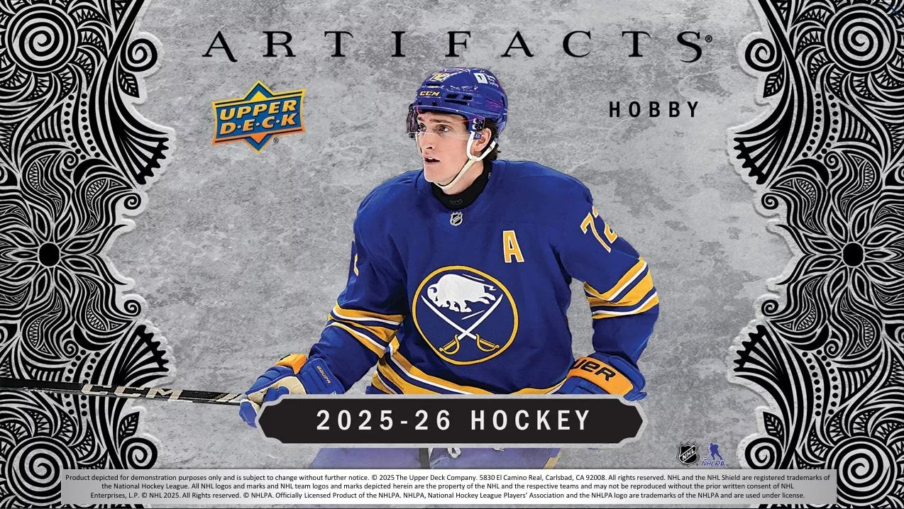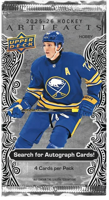 The latest edition of Artifacts® features a loaded 240-card base set which includes redemption cards for new-skating 2025-26 rookies. Complete the set: Base Set (1-100), Stars (101-135; numbered to 699), Goalies (136-150; numbered to 699), Greats (151-170; numbered to 699), Rookies (171-200; numbered to 999), and Rookie Redemptions (201-240).