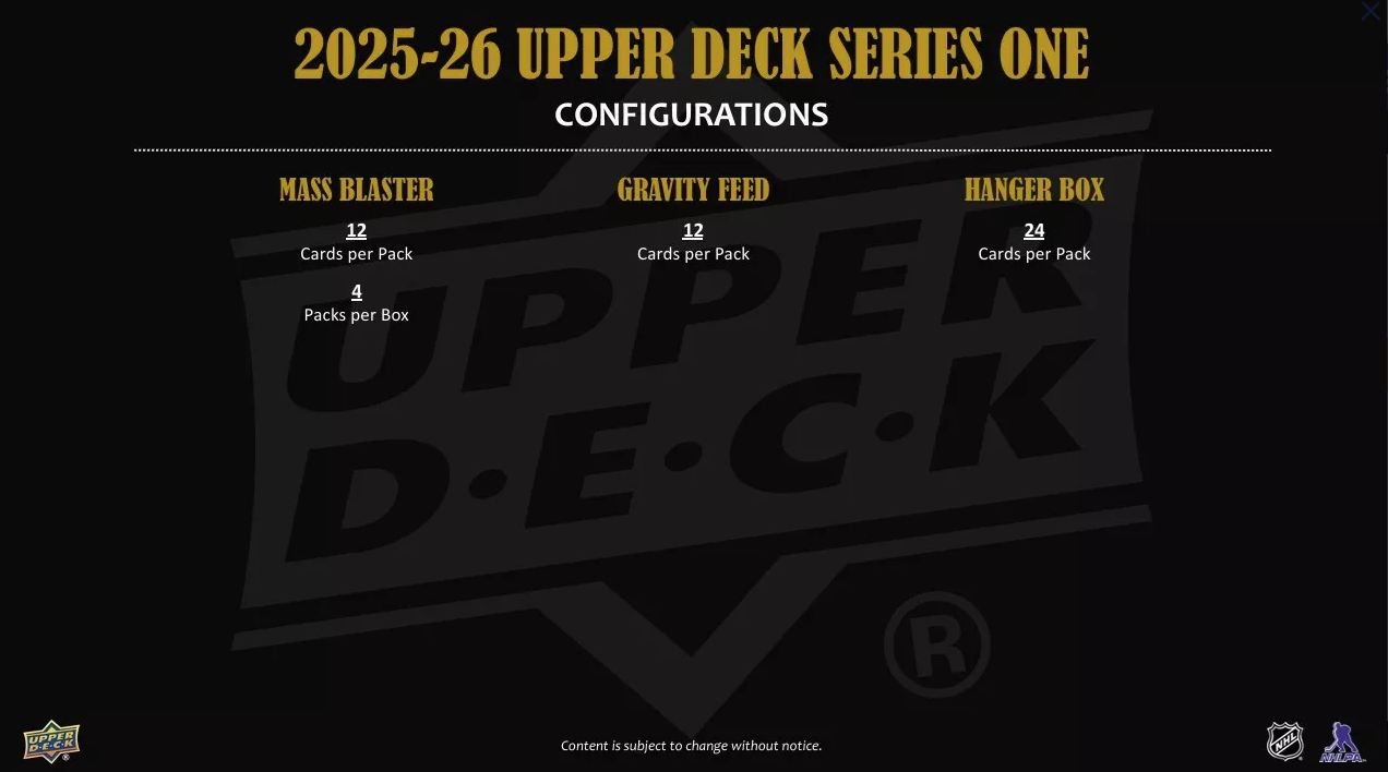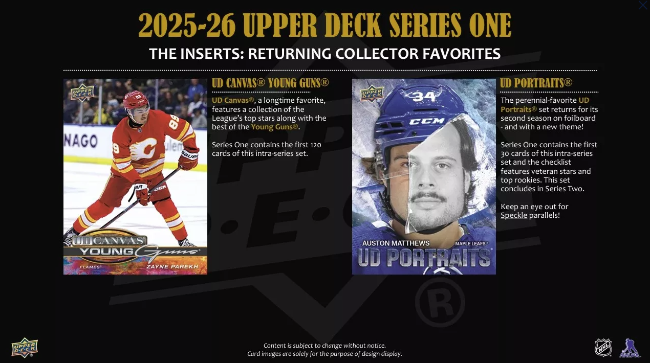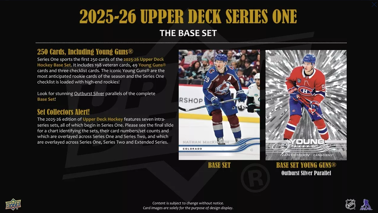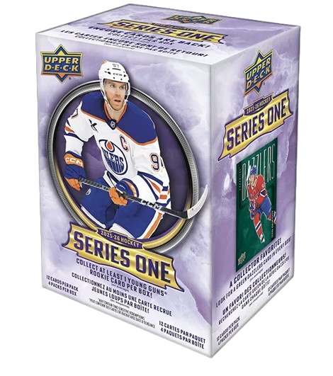Series 1 sports the first 250 cards of the 2025-26 Upper Deck Base Set. It includes 198 veteran cards, 49 Young Guns® cards and three checklist cards. The iconic Young Guns® are the most anticipated rookie cards of the season and the Series 1 checklist is loaded with high-end rookies! Keep an eye out for stunning Outburst Silver parallels of the complete Base Set!