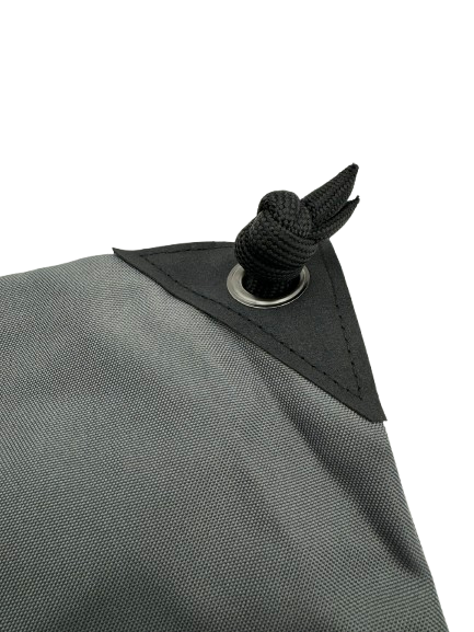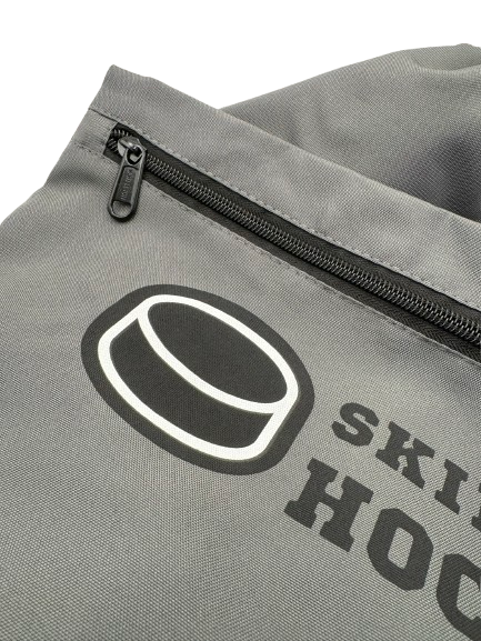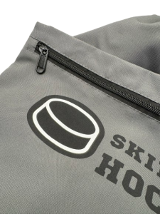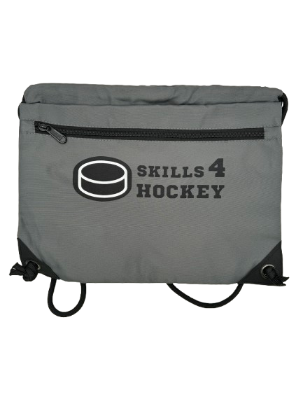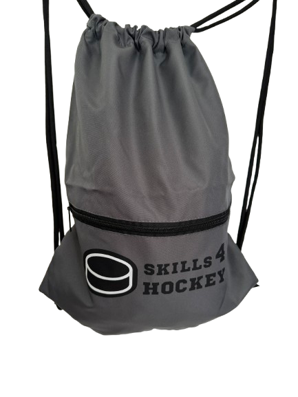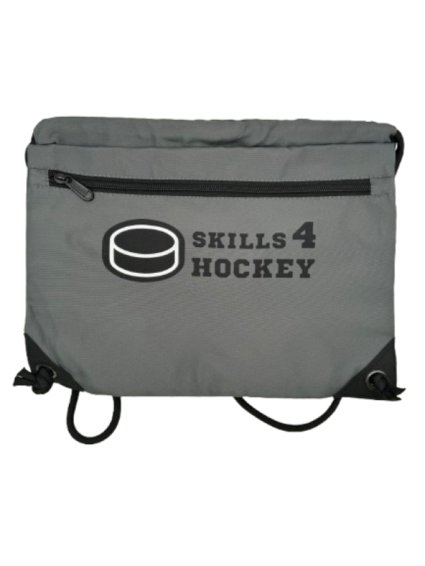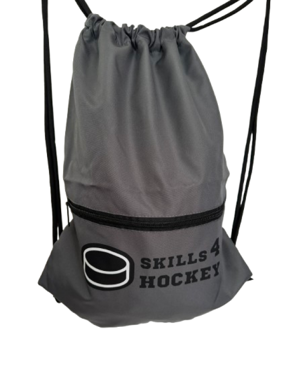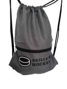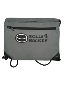 Lightweight grey drawstring backpack with black cords, our Skills4Hockey logo, and a small zip pocket. Durable material, spacious main compartment, ideal for training and everyday use.